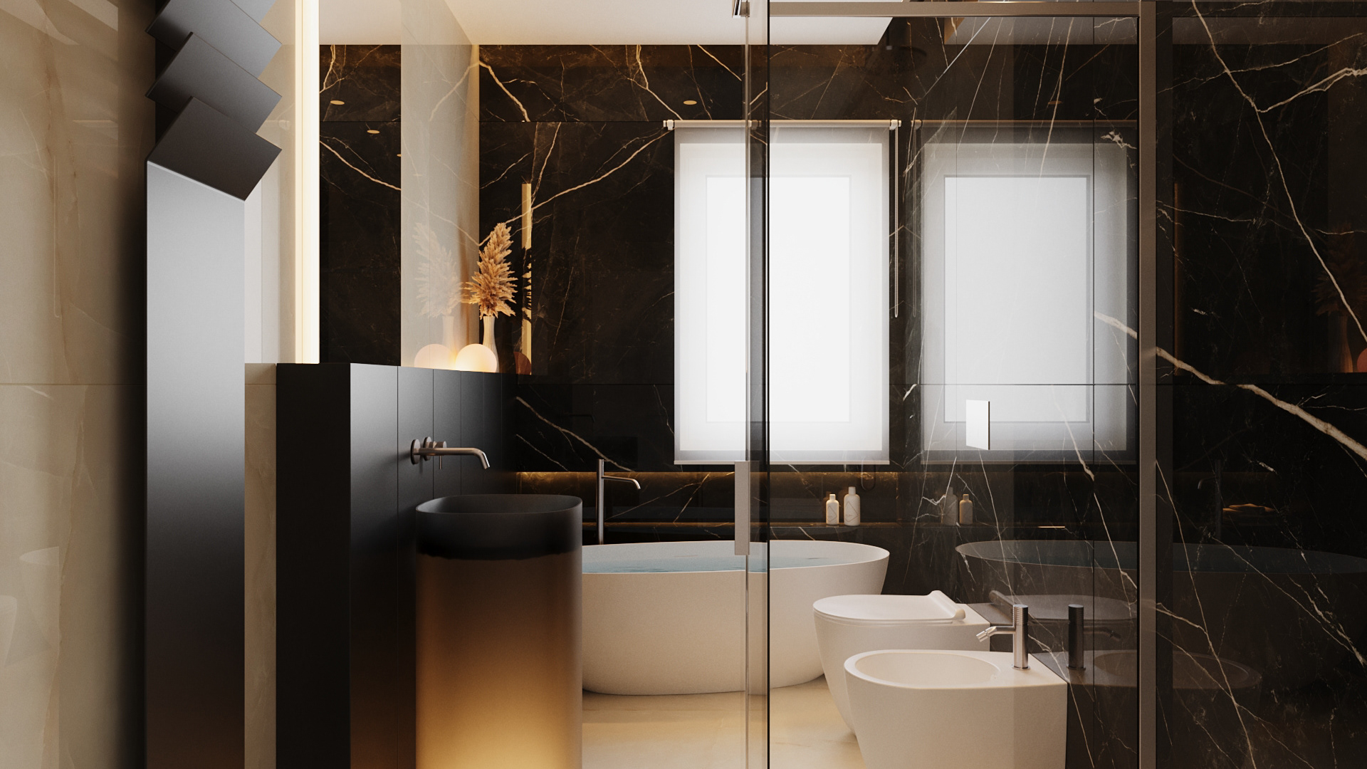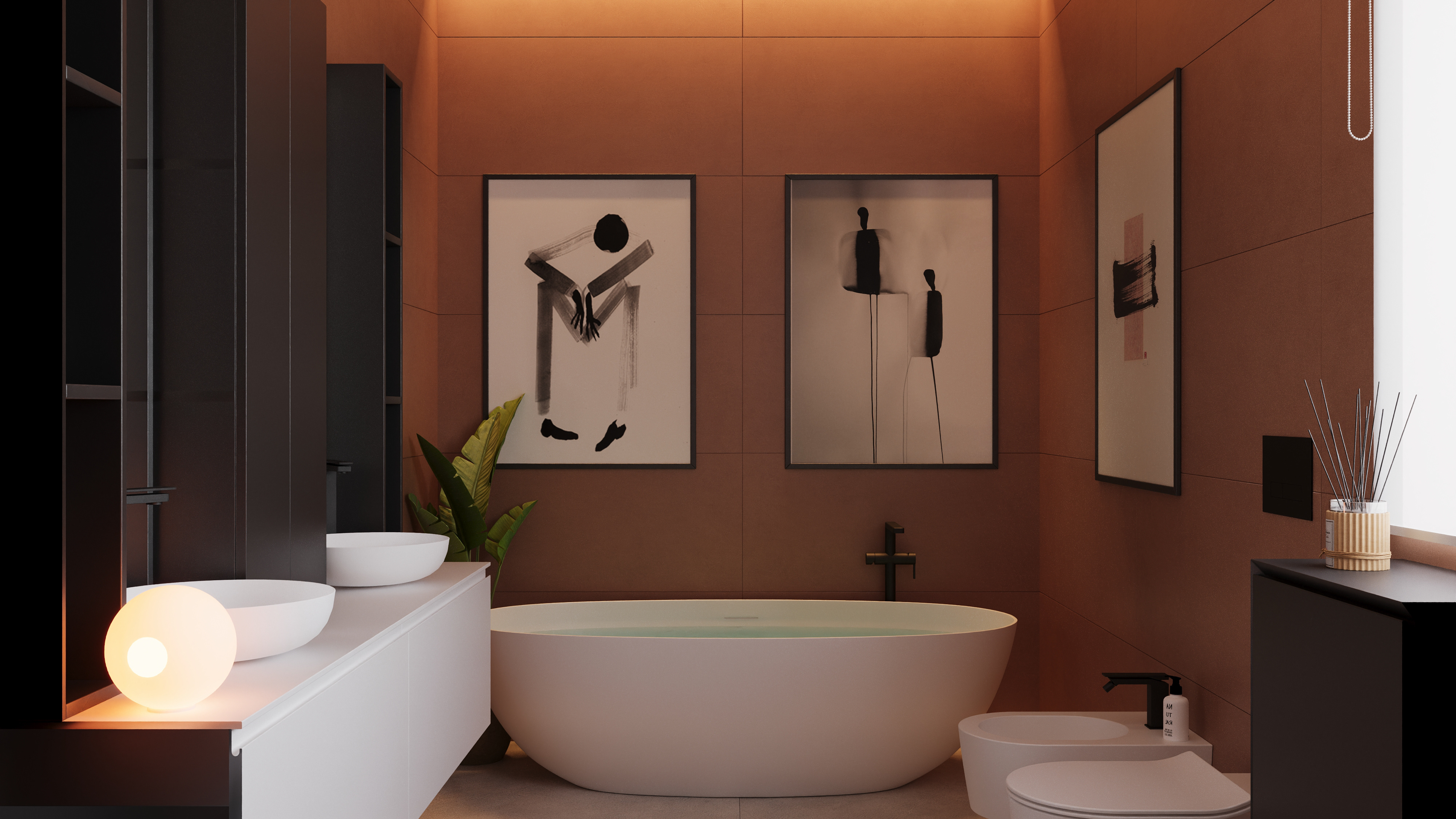 A modern bathroom featuring warm, dark tones and soft lighting, creating a cozy and refined atmosphere. Clean details and balanced contrasts enhance its contemporary character.