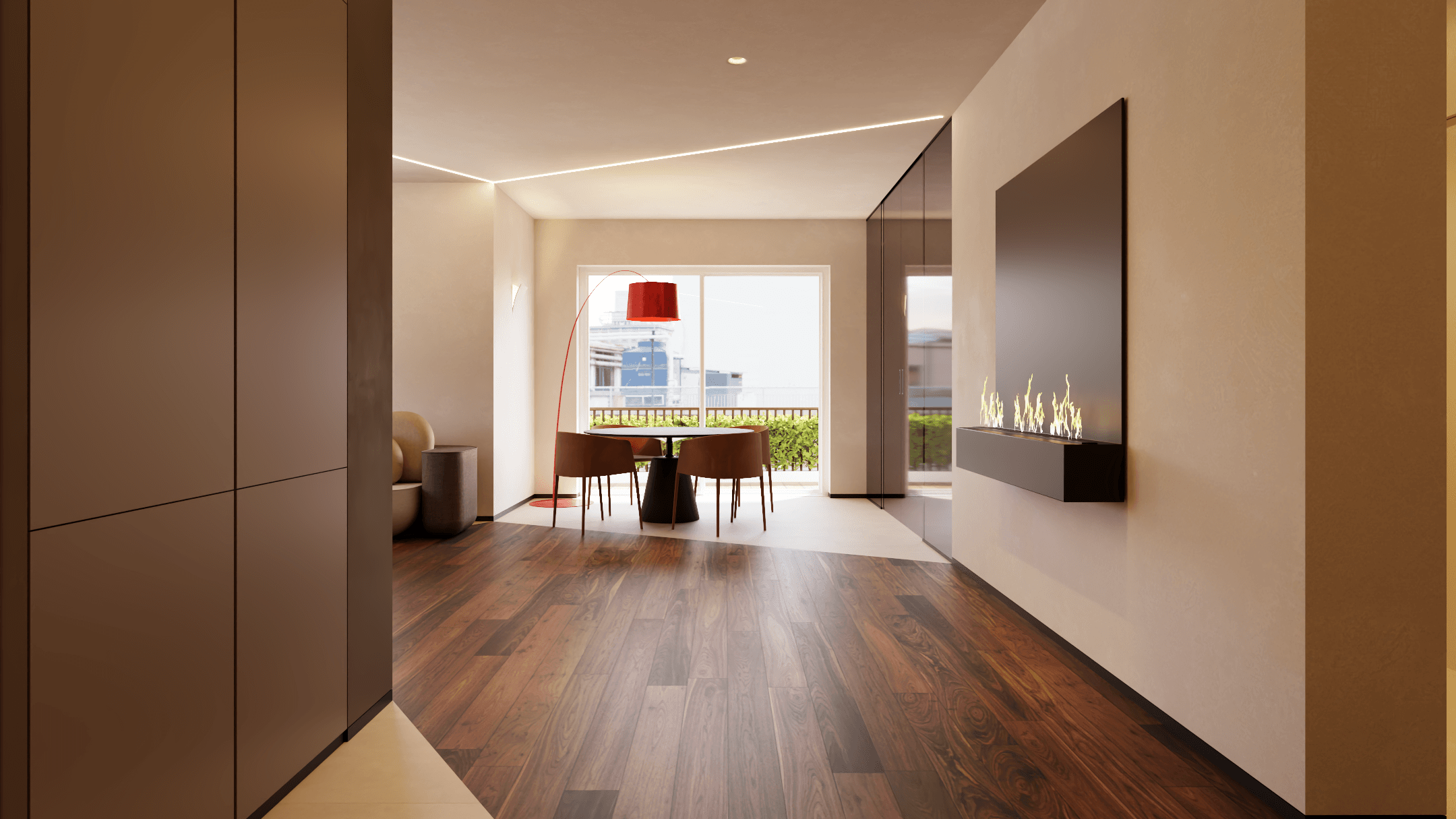 Contemporary interior design featuring warm materials, integrated lighting, and clean geometric lines. The open space connects the entrance, living, and dining areas seamlessly, enhanced by a suspended fireplace and refined attention to detail.