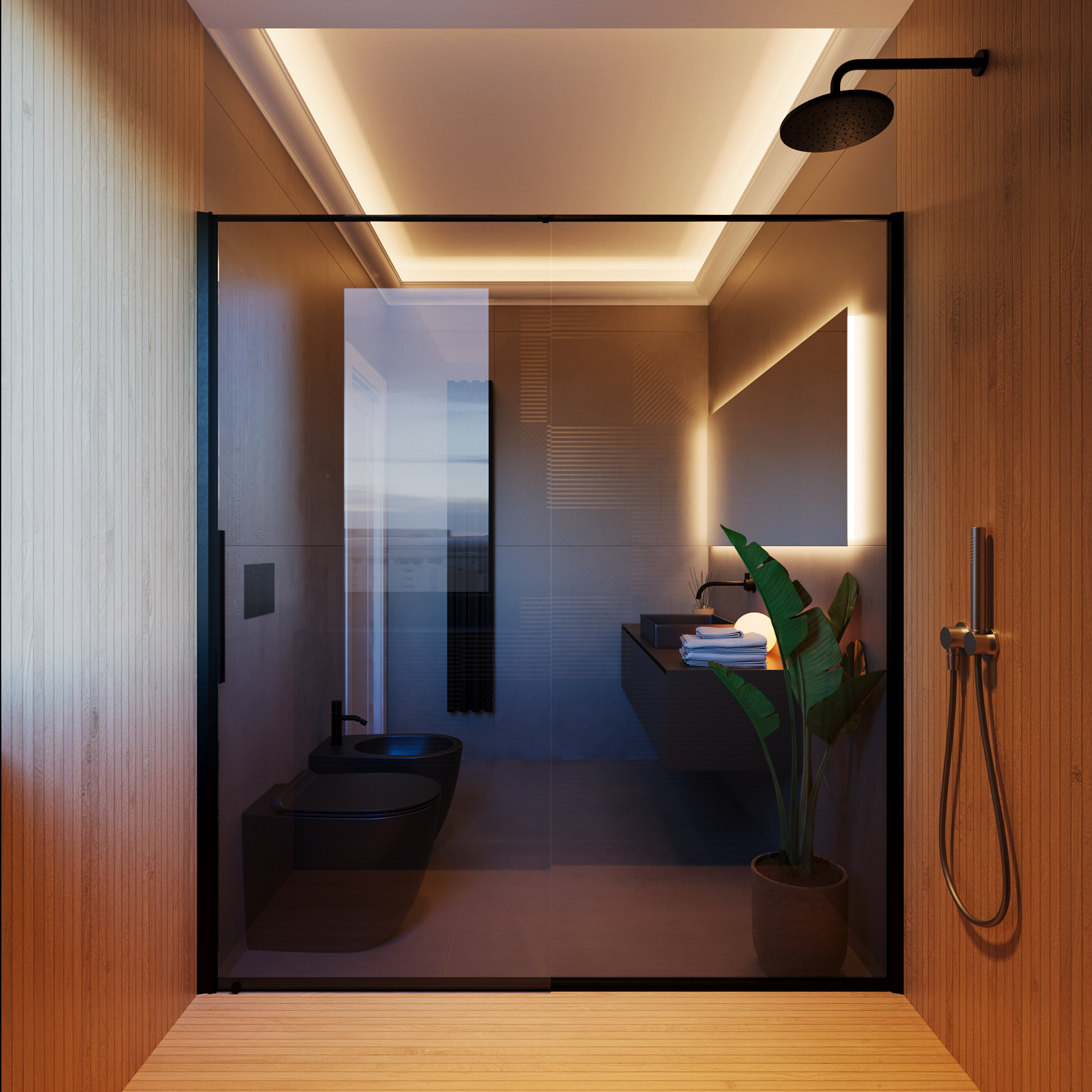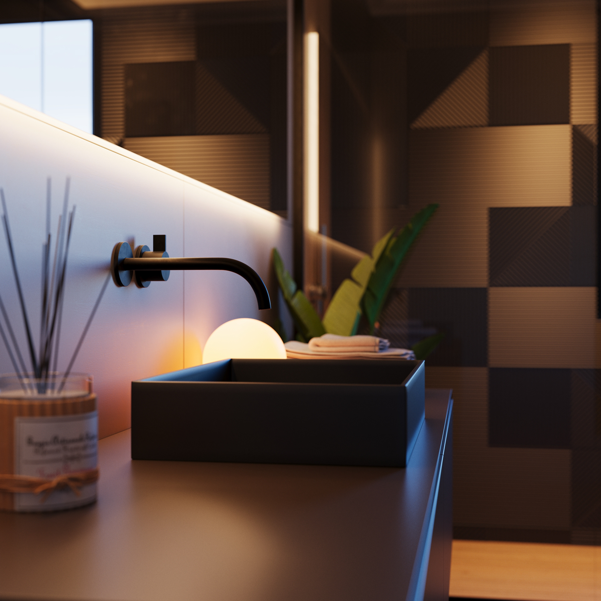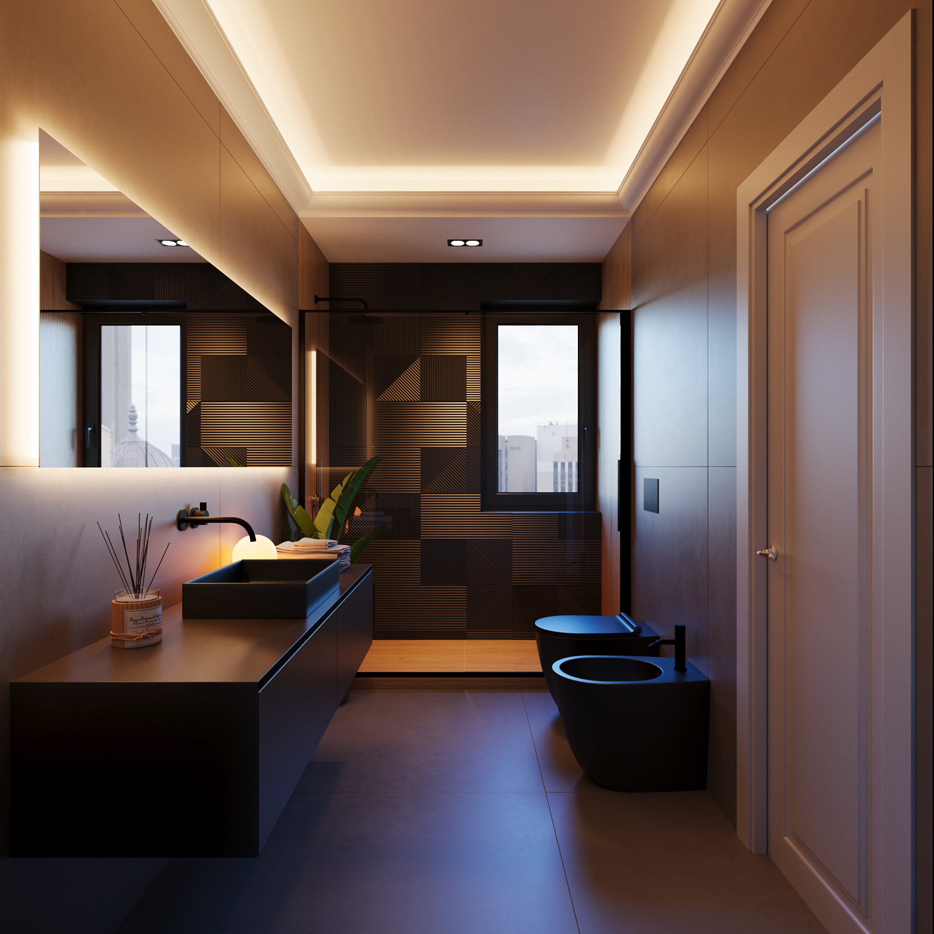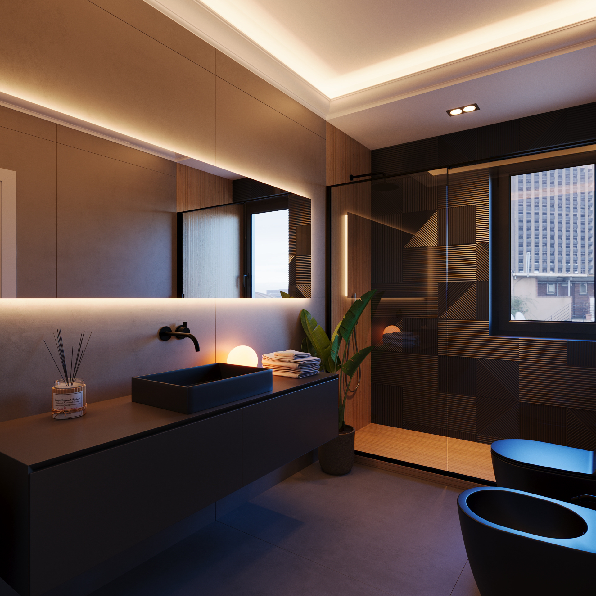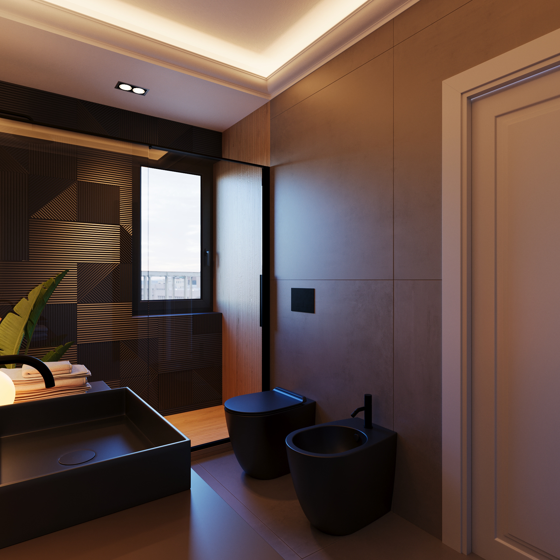 A modern bathroom featuring warm, dark tones and soft lighting, creating a cozy and refined atmosphere. Clean details and balanced contrasts enhance its contemporary character.