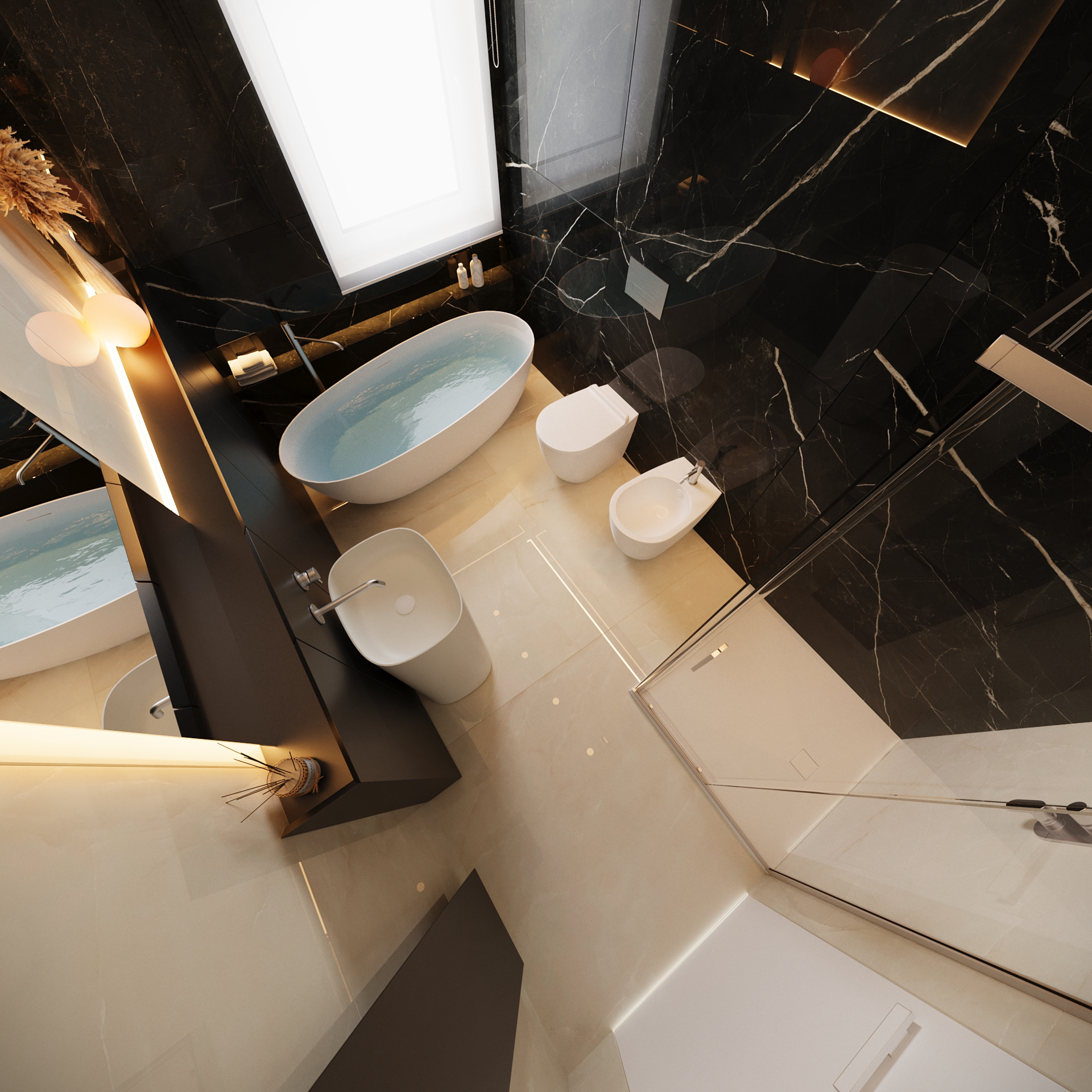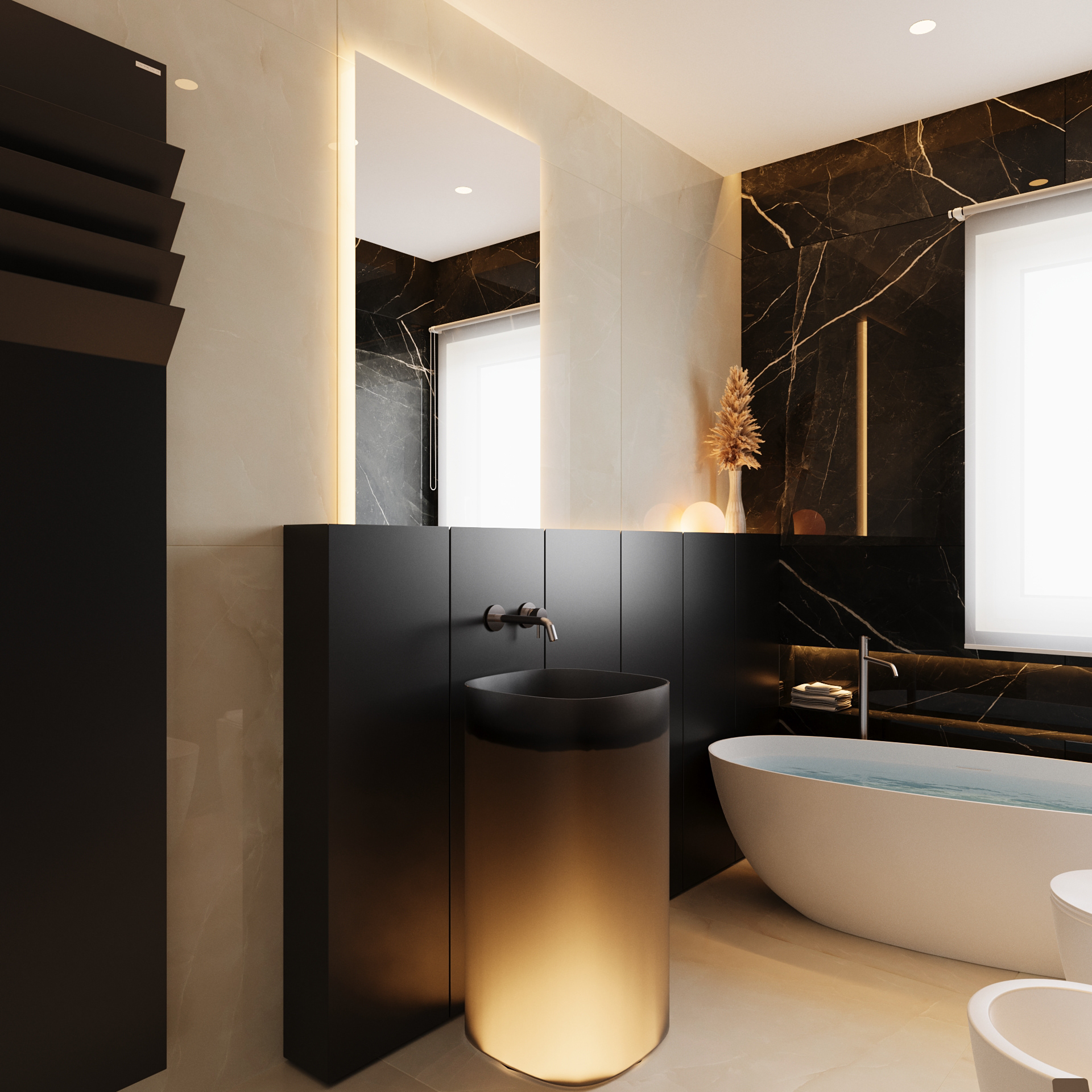Elegant bathroom with cool materials and warm lighting, featuring clean lines and a welcoming atmosphere.