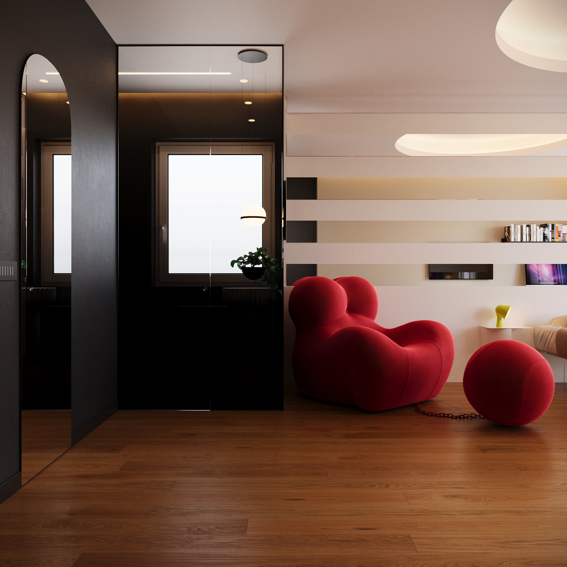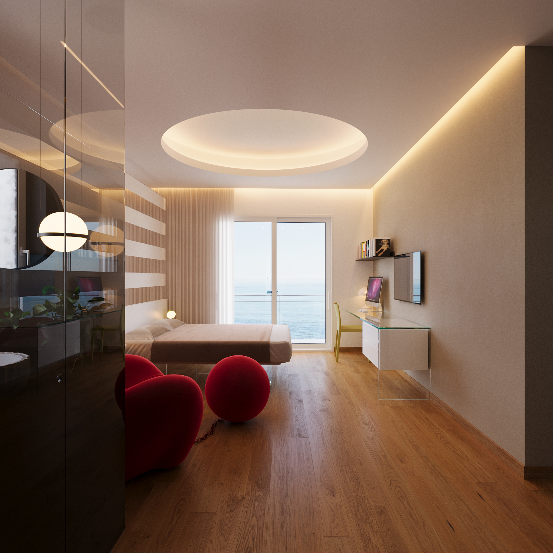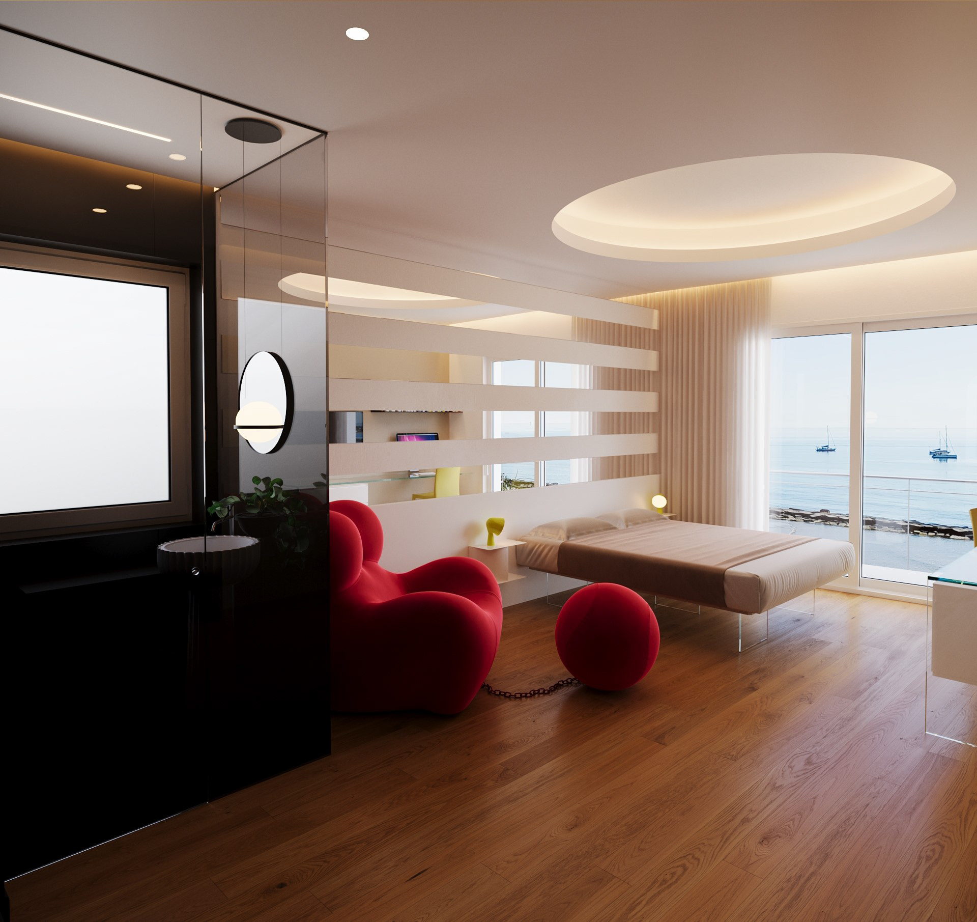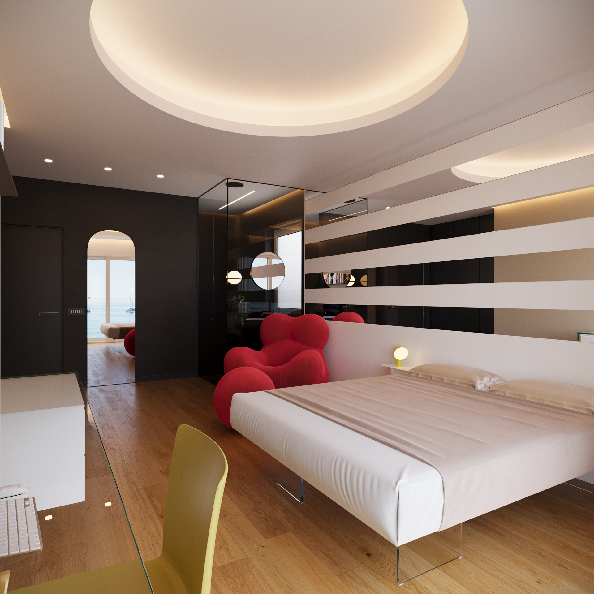 A contemporary bedroom with an en-suite bathroom, featuring gentle lighting, cozy materials, and a soothing ambience. Sleek lines and subtle details shape a comfortable, modern sanctuary.