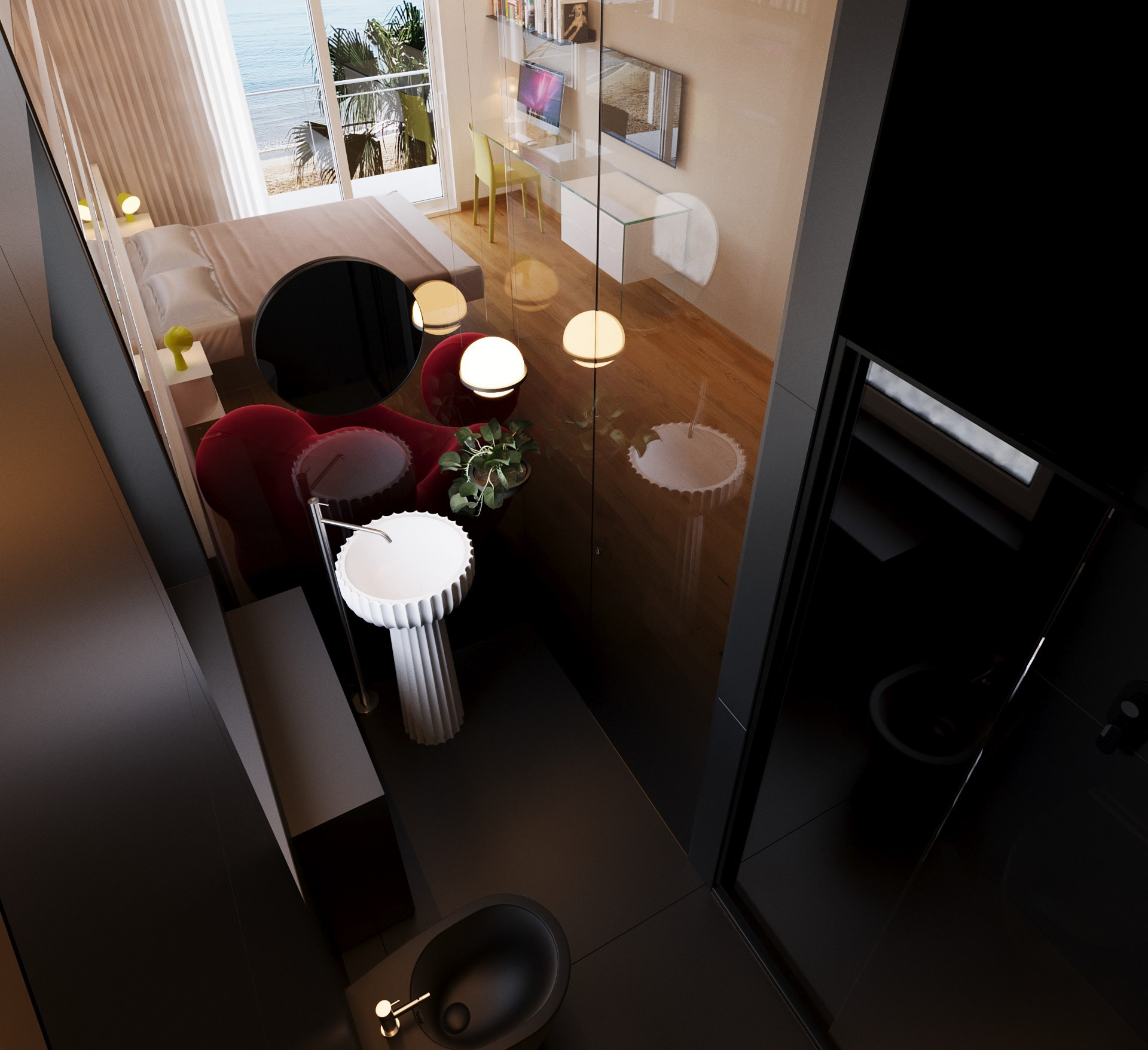 bedroom and bathroom