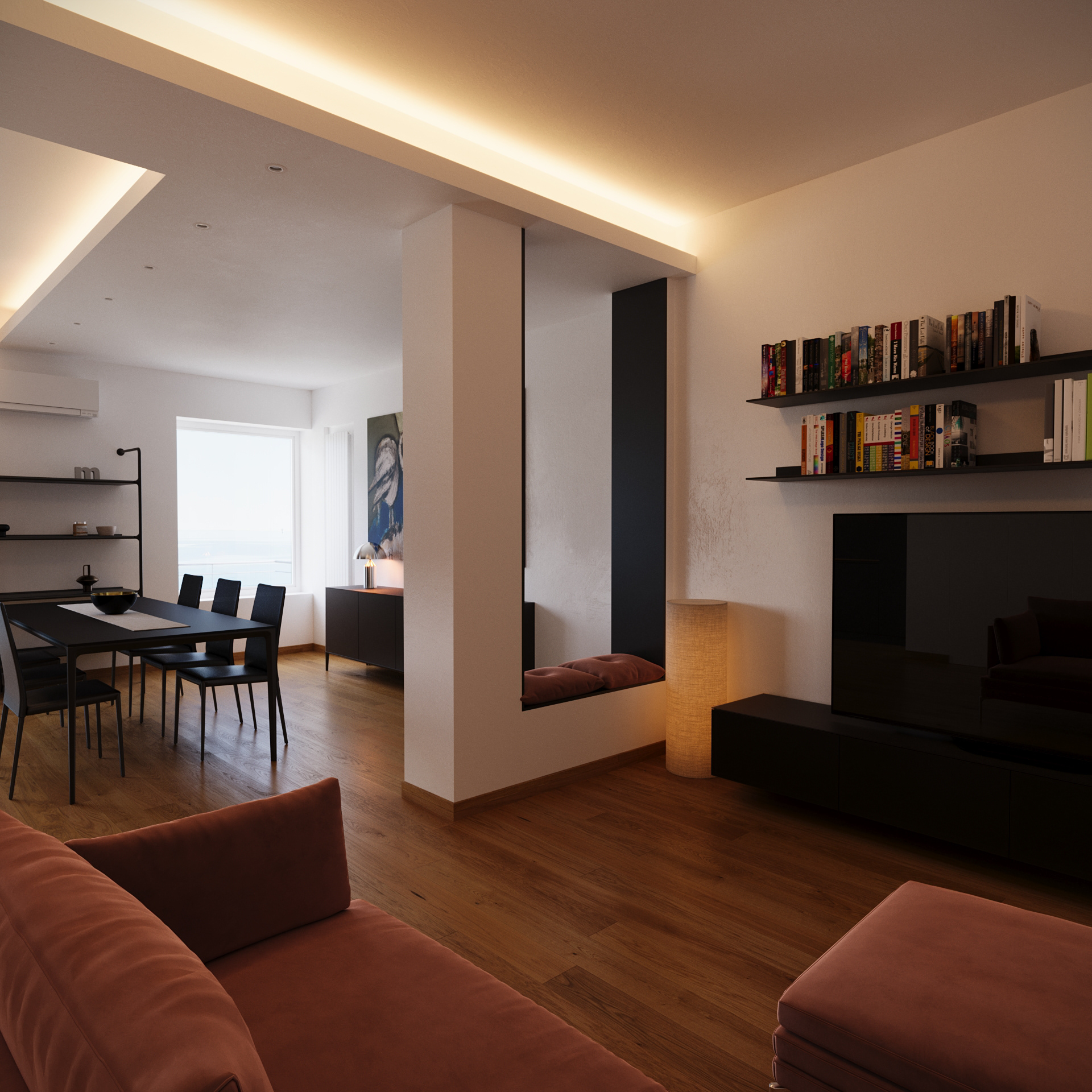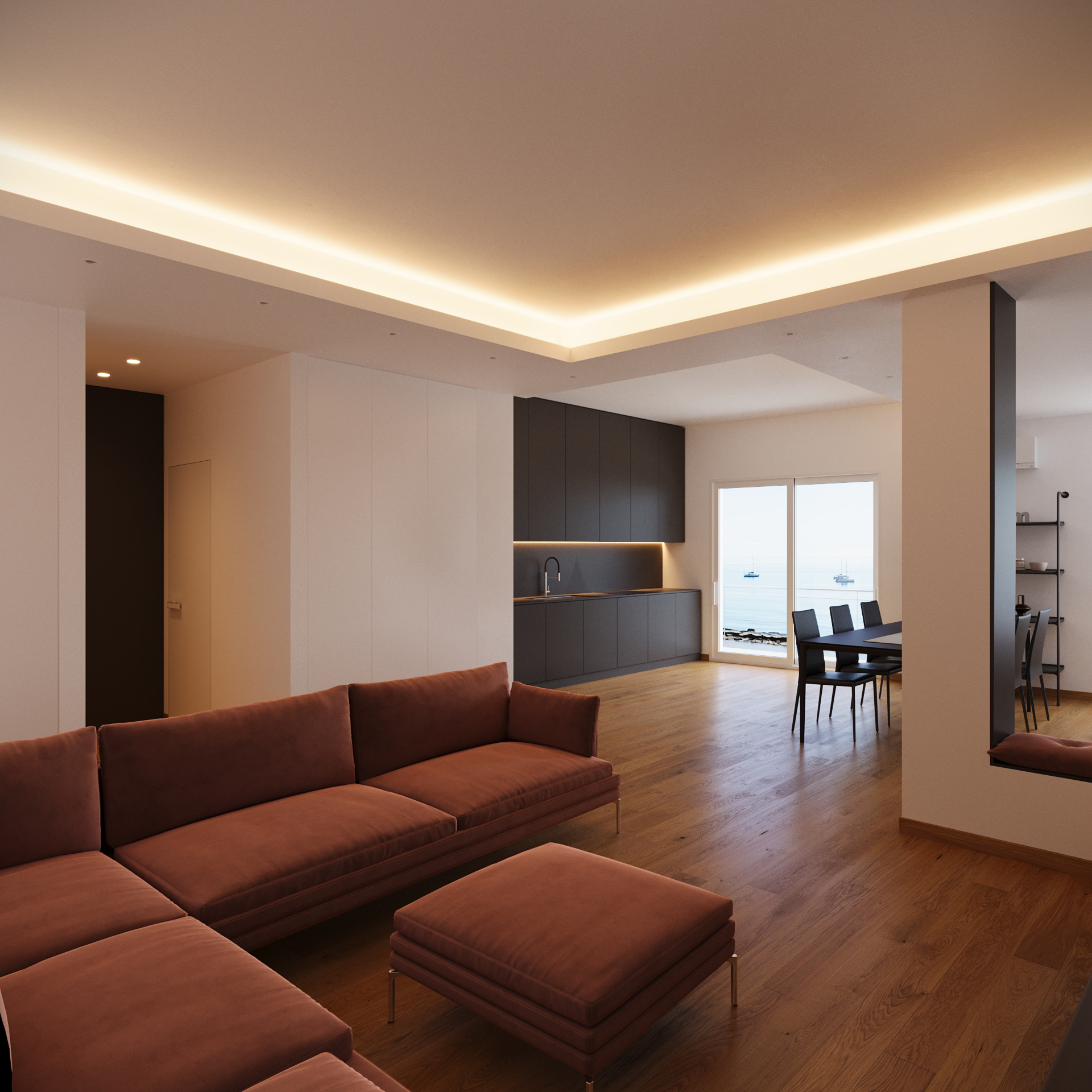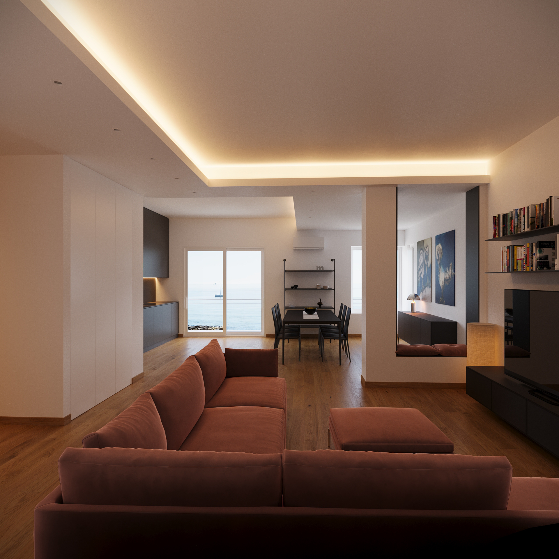 A modern seaside interior featuring soft lighting, warm textures, and a welcoming atmosphere. Clean lines and subtle coastal accents create a refined sense of comfort and serenity.